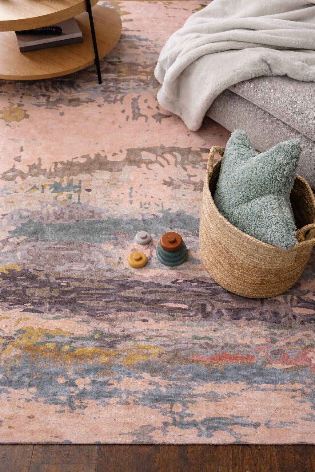 Ręcznie przędzona wełna nadaje dywanowi unikalną, lekko strukturalną powierzchnię z subtelnym połyskiem – znak prawdziwego rzemiosła. Jednocześnie materiał działa termoizolacyjnie, odpycha zabrudzenia i zapewnia przyjemny klimat w pomieszczeniu.