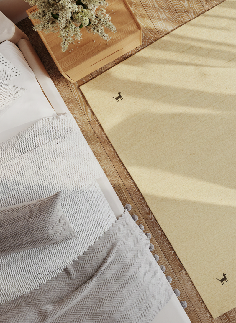 Ręcznie przędzona wełna nadaje dywanowi unikalną, lekko strukturalną powierzchnię z subtelnym połyskiem – znak prawdziwego rzemiosła. Jednocześnie materiał działa termoizolacyjnie, odpycha zabrudzenia i zapewnia przyjemny klimat w pomieszczeniu.